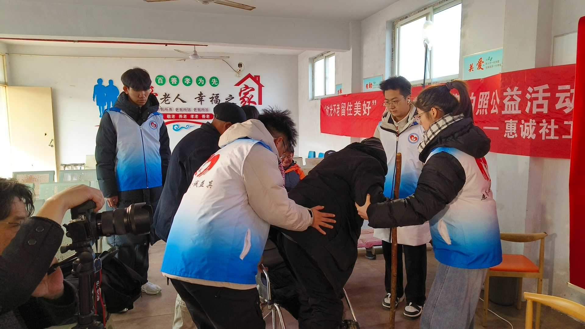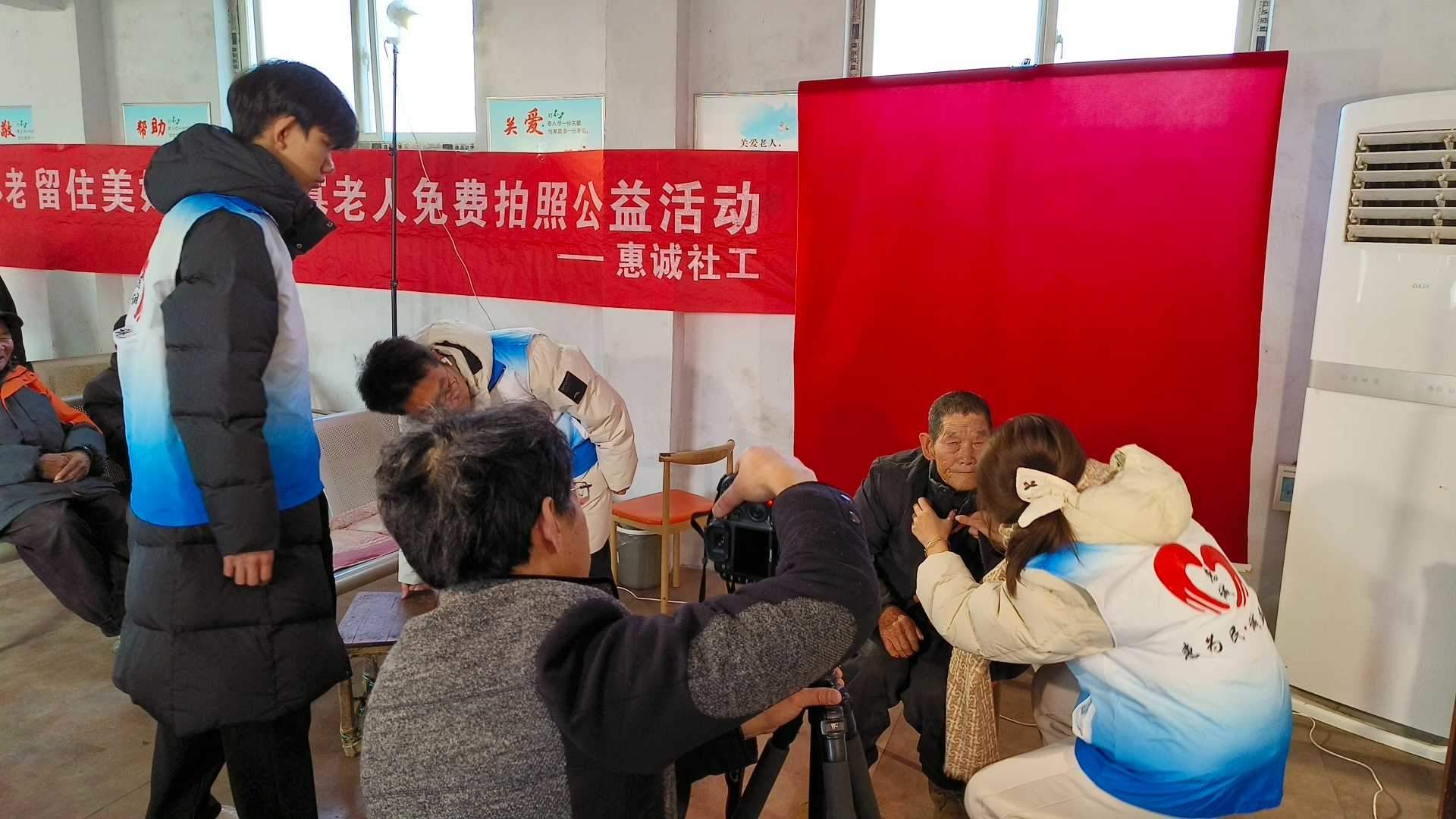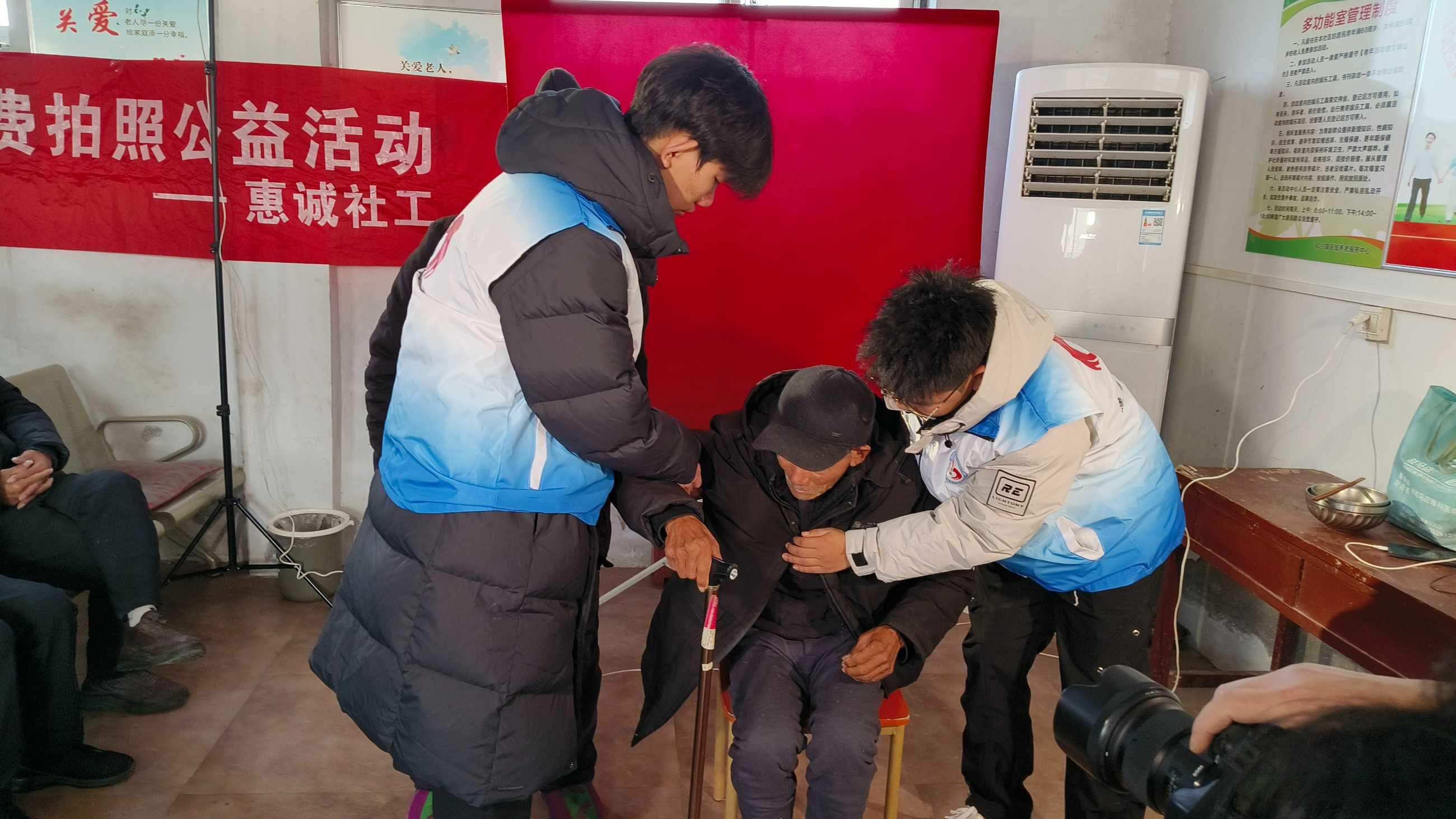 上午九点,志愿者们便已带着设备和满腔热情抵达敬老院。社工周冰已提前与院方做好细致沟通。从县城集合出发,到十几公里外的敬老院,一路的颠簸也掩不住大家的期待。在院方准备的小礼堂里,志愿者们迅速而有序地忙碌起来:撑起背景幕布、调试灯光与相机、摆放座椅……每一项准备都透着细心。随后,志愿者们轻轻走到老人身边,有的俯身为他们仔细整理衣领和鬓角,有的小心翼翼地搀扶着腿脚不便的老人缓缓移步,有的则握着老人的手,用熟悉的乡音唠起家常,询问着近日的冷暖与餐食。这些自然而然的举动,让原本有些安静拘谨的礼堂,渐渐流淌开一股家一般的暖意。