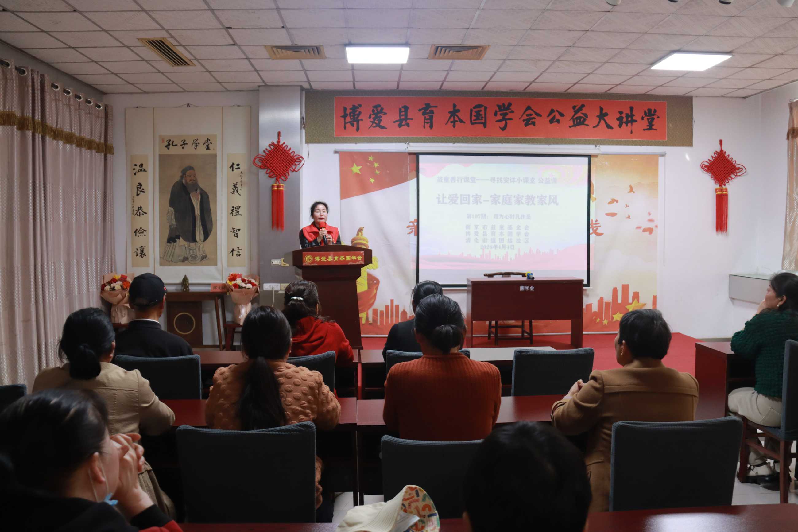 为深入推进党建引领基层治理,传承优良家风家教,化解家庭矛盾,滋养个人身心,2026年4月4日下午,第107期益童善行课堂——“让爱回家·家庭家教家风公益课堂”在育本国学会公益课堂顺利举办。本次活动由南京市玄武区益童基金会、博爱县育本国学会党支部、清化镇街道团结社区联合主办,以党建引领为核心,充分发挥党支部在社区治理和家风建设中的战斗堡垒作用,吸引了众多社区居民、志愿者及国学爱好者参与。 课堂在全员诵读《弟子规》的朗朗书声中拉开帷幕。开课环节,全体人员齐唱《国歌》、《祖国颂》,志愿者手语舞《感恩一切》、诵读《社会主义核心价值观》,将爱国情怀与文明风尚深度融合。 核心课程环节,大家集中观看“学习强国平台”《郭文斌解读<弟子规>》第46集《理为心时凡作圣》,深入学习“恩欲报,怨欲忘”“理服人,方无言”的深刻内涵。 郭文斌先生在本集中深入阐释了“待婢仆,身贵端;虽贵端,慈而宽”“势服人,心不然;理服人,方无言”等训喻。他指出,以理服人、以德化人是家庭和睦与社会治理的根基。通过学习,大家深刻认识到:知恩报恩、以德报怨,能有效化解家庭矛盾、增益个人身心能量;而“理为心”的智慧,更是实现家庭幸福、社区和谐的重要密码。 在交流分享环节,多位学员结合自身经历谈到:过去常因“以势压人”激化家庭矛盾,如今领悟到“慈而宽”的真谛,学会用理解与尊重沟通,亲子关系、夫妻关系明显改善。大家一致认为,此类公益课堂对个人修心、家庭建设及基层社会治理具有不可替代的积极作用。 适逢清明,课堂特设感恩追思环节。大家共同观看焦波老师的《俺爹俺娘》,在温情影像中感念父母养育之恩; 志愿者表演《跪羊图》手语舞,以至诚之心传递孝亲美德; 同时开展“传承红色基因 —— 祭英烈”活动,全体人员肃立向革命英烈行三鞠躬礼,缅怀英烈、铭记英雄事迹,赓续红色血脉。 最后,全体人员在《歌唱祖国》的激昂歌声中圆满结束课程。 本次公益课堂以党建为引领,依托益童善行课堂品牌优势,将经典传统文化融入家风家教建设,既帮助群众滋养身心、树立感恩包容的心态,又为化解家庭矛盾、促进家庭和谐提供了思路,更以文化润心助力基层社会治理,推动形成家风正、民风纯、社区和的良好氛围,切实将党建引领的优势转化为服务群众、提升治理效能的实际成效。 |