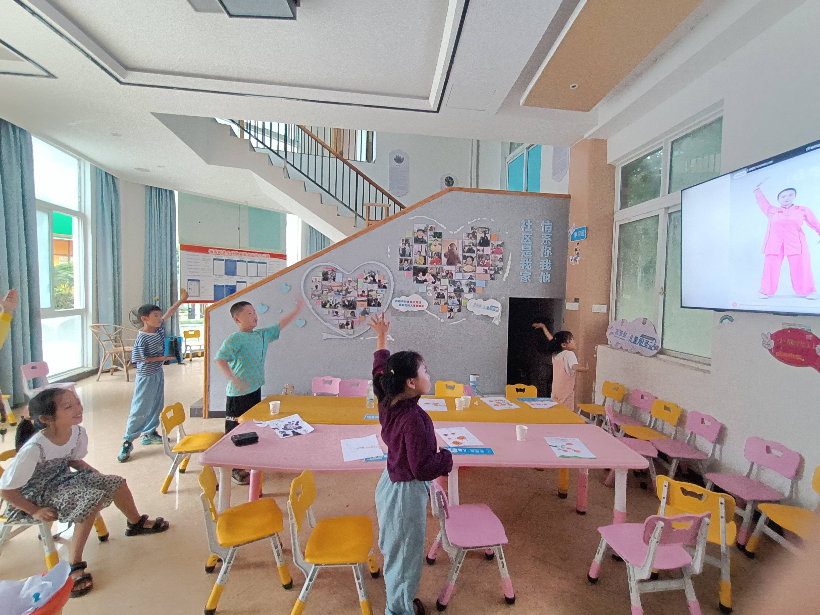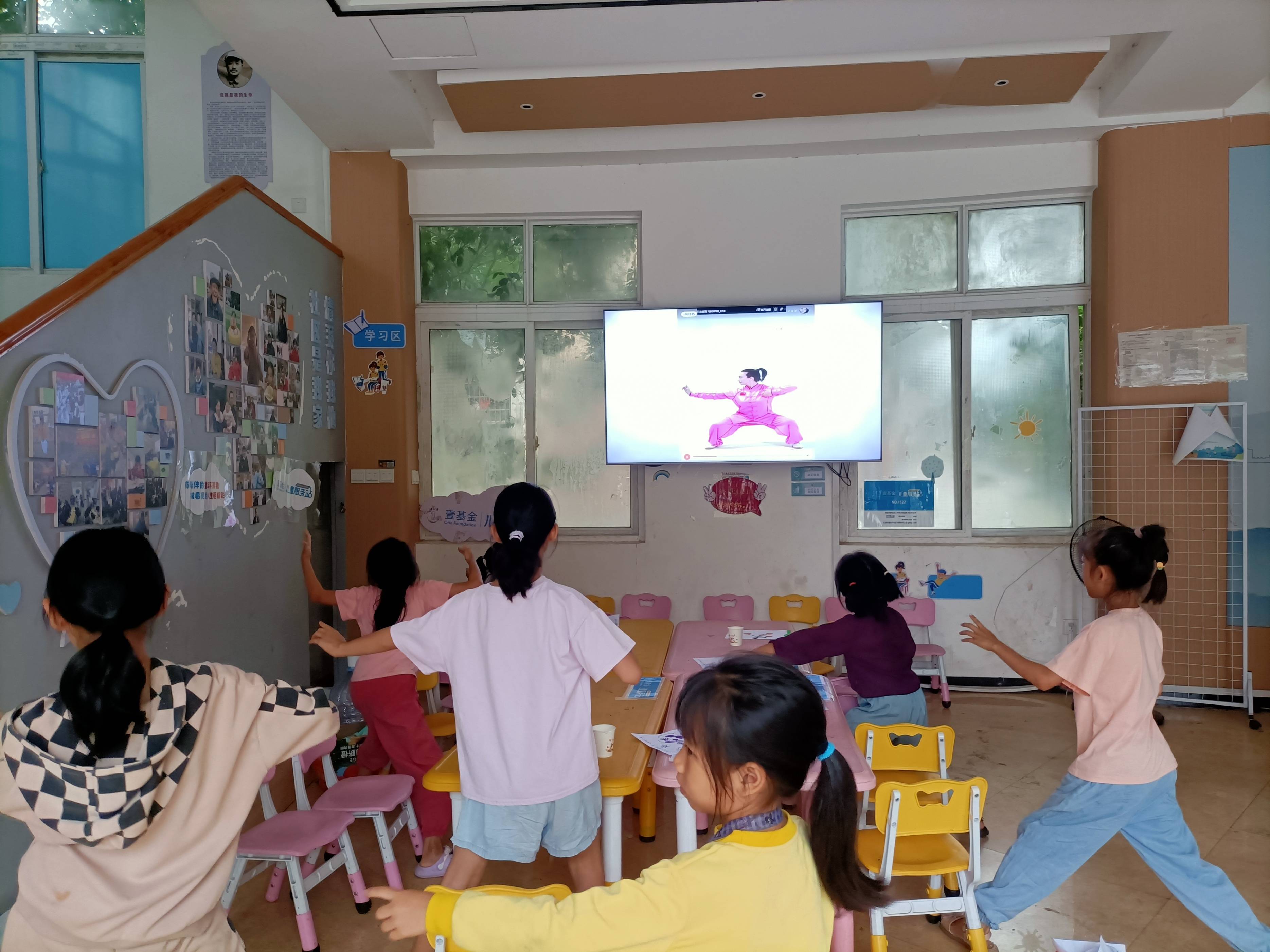 志愿者还给孩子们体验了传统养生,进行八段锦趣味教学,志愿者说道:“现在,我们要变身功夫小侠!”孩子们都很积极地跟着视频教学摆动着四肢,起初动作生疏,但经过分组练习,孩子们已能连贯完成。一位害羞的小女孩兴奋地说:“回家要教奶奶做!”